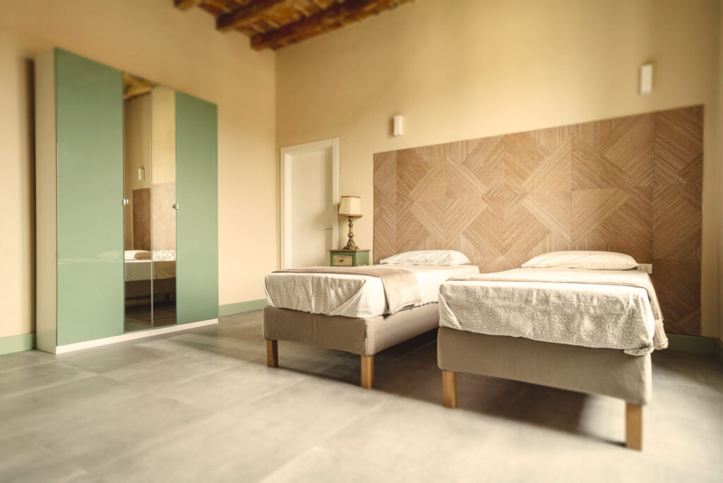 Ogni camera presso la Dimora de Roteris è arredata in stile moderno e l’atmosfera che si respira all’interno è accogliente e distesa: letti e tessuti innovativi certificati anallergici e anti-acari (possibilità a scelta di letto matrimoniale o di due letti separati), comodini, divanetti, poltroncine e scrittoio. Ogni camera è dotata di un bagno privato con doccia, set di biancheria da bagno, macchina del caffè a cialde e bollitore elettrico.